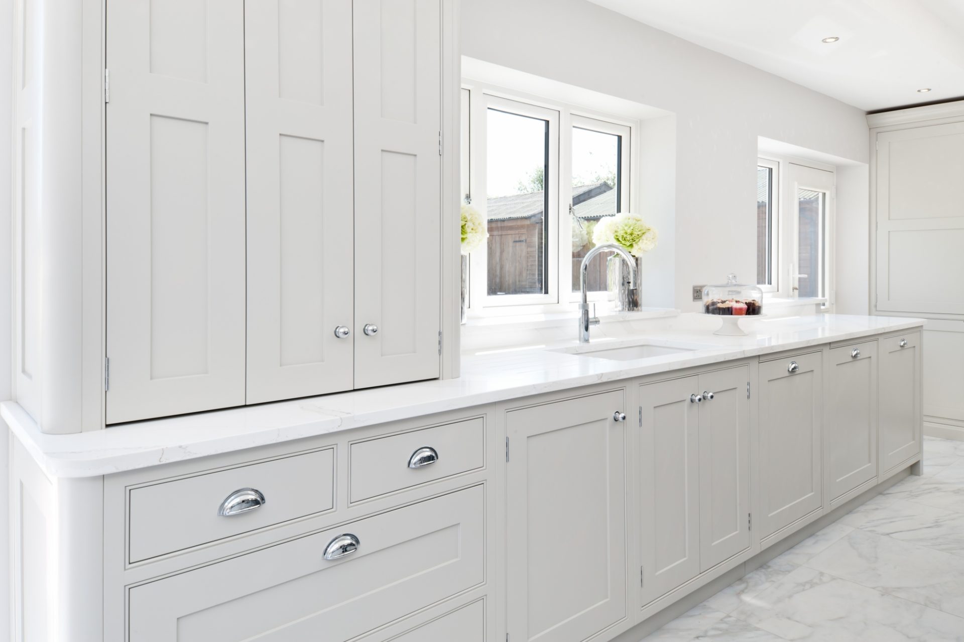 Our client wanted something special as a finish to their stunning handmade units. We worked closely with the client for four months and provided six different quotations for custom worktops and edging options. Our quotation options covered different marble look quartz materials, different profile edges such as mitred and pencil edges and various tweaks to the dimensions in the design plan.